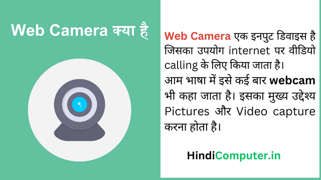 Web Camera एक इनपुट डिवाइस है जिसका उपयोग internet पर वीडियो calling के लिए किया जाता है। आम भाषा में इसे कई बार webcam भी कहा जाता है। इसका मुख्य उद्देश्य Pictures और Video capture करना होता है।